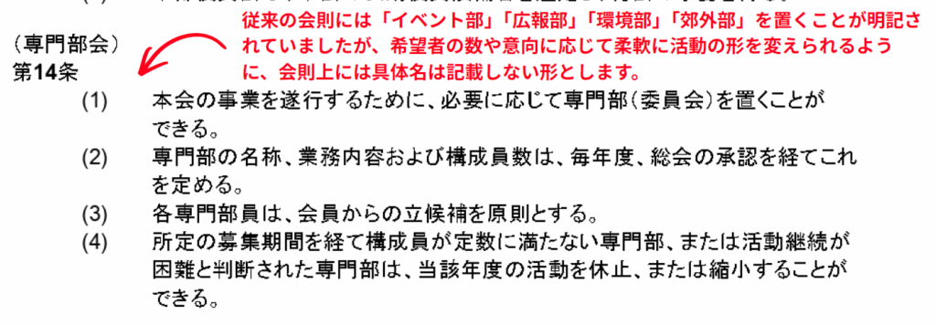 10〜12月に全4回にわたり実施したアンケートの結果を踏まえて、来年度より「完全エントリー制(やりたい人がやる)」「活動のスリム化」「会計の単年度使い切り」へと移行するための臨時総会(書面開催)を開催いたします。