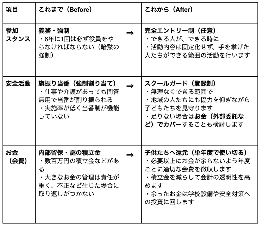 保護者のライフスタイルの変化に合わせ、「義務」から「任意(エントリー制)」への転換、組織の簡素化、および会計の透明化を図るため、会則の大幅な改正を行います。